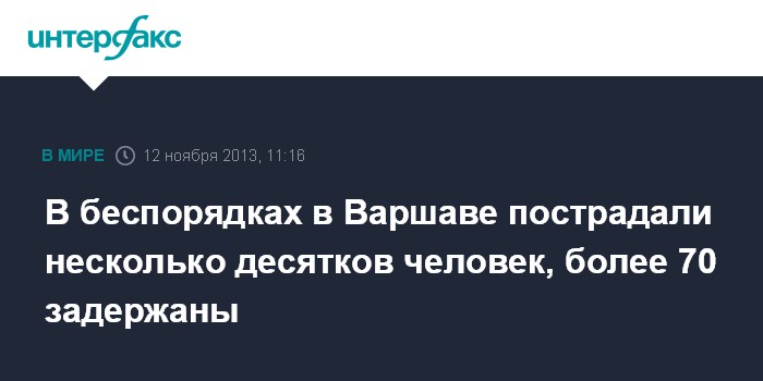 Варшава. 12 ноября. INTERFAX.RU - Не менее 19 человек получили травмы, 72 задержаны в ходе беспорядков в Варшаве в понедельник, сообщает во вторник польский телеканал ТВН24 со ссылкой на данные полицейского управления польской столицы.