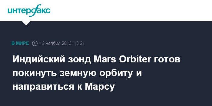 Дели. 12 ноября. INTERFAX.RU - Первый индийский марсианский зонд Mars Orbiter во вторник успешно перешел на более высокую околоземную орбиту на высоту более 100 тыс. км и теперь способен стартовать к Марсу, сообщает индийская газета Times of India.