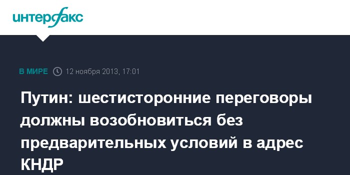 "Я считаю, что самой главной задачей на сегодняшний день является разблокирование этих переговоров, их возобновление, и все препятствия, которые мешают началу этого процесса, должны быть устранены. Если мы будем постоянно выдвигать предварительные условия для начала переговоров, они могут никогда не начаться", - сказал Путин в интервью южнокорейской телерадиовещательной компании KBS в преддверии визита в Сеул 13 ноября.