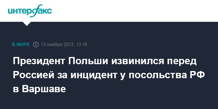 Варшава. 13 ноября. INTERFAX.RU - Президент Польши Бронислав Коморовский во время интервью польскому Radio ZET попросил у России извинений за "абсолютно скандальные события у российского посольства".