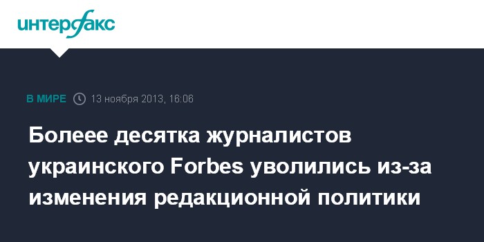 Киев. 13 ноября. INTERFAX.RU - 14 журналистов украинского издания Forbes во вторник написали заявления об увольнении из-за попыток изменить редакционную политику, сообщает интернет-издание "Украинская правда" со ссылкой на шеф-редактора Forbes Бориса Давиденко.