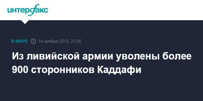 Каир. 14 ноября. INTERFAX.RU - Власти Ливии приняли решение об увольнении из армии более 900 солдат, выступавших на стороне бывшего ливийского лидера Муаммара Каддафи во время антиправительственного восстания в 2011 году.