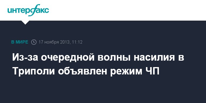 Дубай. 17 ноября. INTERFAX.RU - Режим чрезвычайного положения сроком на 48 часов введен в воскресенье в столице Ливии Триполи, сообщает межарабский телеканал Al Jazeera.