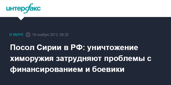 Москва. 19 ноября. INTERFAX.RU - Недостаточное финансирование и деятельность вооруженных группировок мешают сирийским властям выполнять свои обязательства в сфере химического разоружения, заявил посол Сирии в Москве Рияд Хаддад.