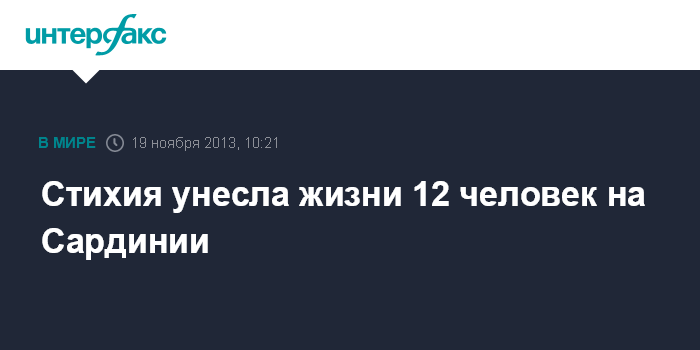 Рим. 19 ноября. INTERFAX.RU - По меньшей мере, 12 человек стали жертвами циклона "Клеопатра" на итальянском острове Сардиния, сопровождающегося ливневыми дождями и сильным ветром, сообщает во вторник итальянская газета Corriere della Sera.
