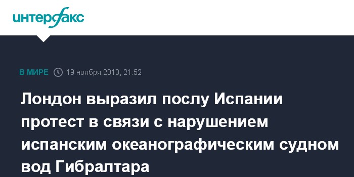 Мадрид. 19 ноября. INTERFAX.RU - Посол Испании в Великобритании Федерико Трильо во вторник вызван в британский МИД, где ему был выражен протест в связи со вторжением судна Испанского океанографического института в территориальные воды Гибралтара, сообщает испанская телерадиокомпания RTVE.