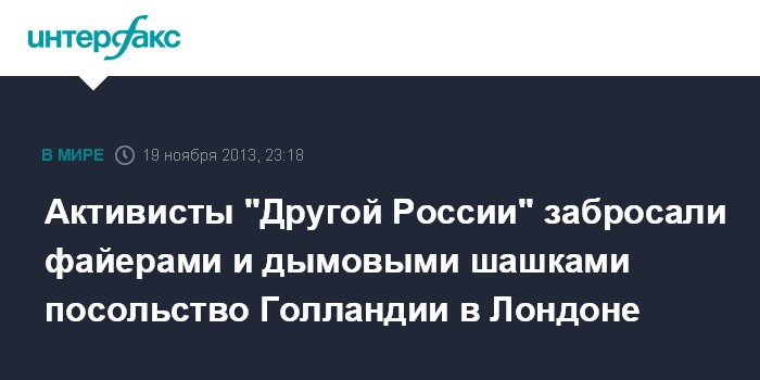 Москва. 19 ноября. INTERFAX.RU - В незарегистрированной партии "Другая Россия" заявили, что активисты этой организации во вторник забросали файерами и дымовыми шашками посольство Голландии в Лондоне, требуя расследования смерти оппозиционера Александра Долматова. "Никто из активистов не задержан", - сообщил во вторник "Интерфаксу" представитель "Другой России" Александр Аверин.