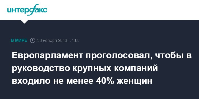 Брюссель. 20 ноября. INTERFAX.RU - Европарламент на пленарной сессии в Страсбурге одобрил в среду значительным большинством голосов директиву ЕС, которая предписывает, чтобы в руководство крупных компаний входило не менее 40% женщин.