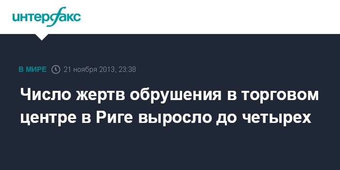 Рига. 21 ноября. INTERFAX.RU - Согласно обновленным данным Государственной пожарно-спасательной службы (ГПСС) Латвии, число погибших при обрушении в торговом центре в Риге выросло до четырех человек, среди погибших один спасатель.