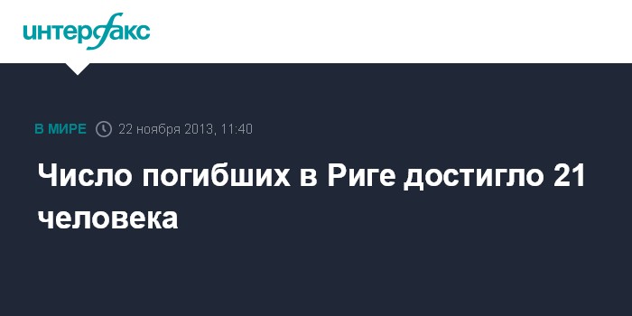 Рига. 22 ноября. INTERFAX.RU - В результате обрушения здания торгового центра в Риге погибли 21 человек, цитирует латвийские СМИ в эфире радио Baltkom представитель "скорой помощи" Илзе Букша, передает портал Mixnews.lv.