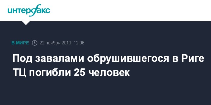 Рига. 22 ноября. INTERFAX.RU - Число жертв обрушения здания торгового центра в Риге продолжает расти и достигло 25 человек, сообщила в эфире радио Baltkom представитель "скорой помощи" Илзе Букша, передает портал Mixnews.lv.