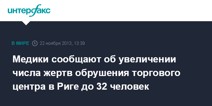 Рига. 22 ноября. INTERFAX.RU - В результате обрушения кровли торгового центра MAXIMA в рижском районе Золитуде погибли 32 человека, сообщил в пятницу днем портал Mixnews.lv со ссылкой на представителя службы неотложной медицинской помощи Латвии Илзе Букшу.