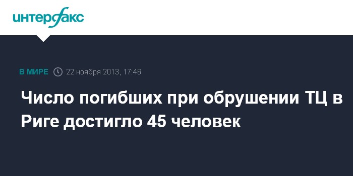 Москва. 22 ноября. INTERFAX.RU - Портал Delfi сообщил в пятницу вечером, что количество погибших в результате обрушения кровли торгового центра в Риге увеличилось до 45 человек.