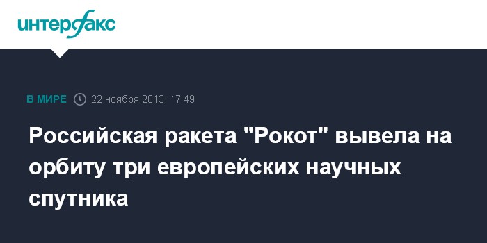 Плесецк (Архангельская область). 22 ноября. INTERFAX.RU - Ракета-носитель "Рокот" с разгонным блоком "Бриз-КМ", стартовавшая в Плесецке, вывела на целевую орбиту три европейских космических аппарата Swarm, сообщил "Интерфаксу" представитель управления пресс-службы и информации Минобороны РФ по Войскам воздушно-космической обороны полковник Дмитрий Зенин.