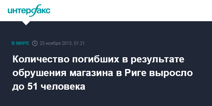 Рига. 23 ноября. ИНТЕРФАКС/BNS - Из-под завалов рижского супермаркета Maxima извлечено тело 51-го погибшего, спасателям остаётся обследовать ещё 350-400 квадратных метров магазина, сообщил в пятницу вечером начальник государственной пожарно-спасательной службы Оскар Аболиньш.