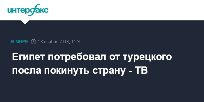 Дубай. 23 ноября. INTERFAX.RU - Власти Египта приняли решение о понижении уровня дипотношений с Турцией и потребовали отъезда из их страны турецкого посла, сообщает в субботу межарабский телеканал Al Arabiya. О причинах подобного шага и реакции Анкары пока не сообщается.