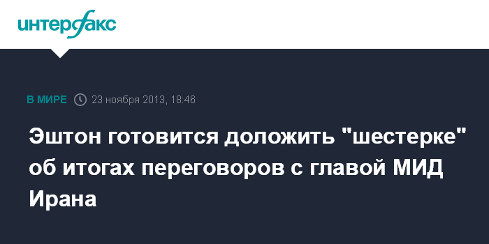"Верховный представитель ЕС Кэтрин Эштон в течение субботы провела интенсивные переговоры с главой МИД Ирана Зарифом. Ей предстоит сообщить о результатах главам МИД стран-членов "шестерки", - написал в Twitter представитель К.Эштон Майкл Манн.