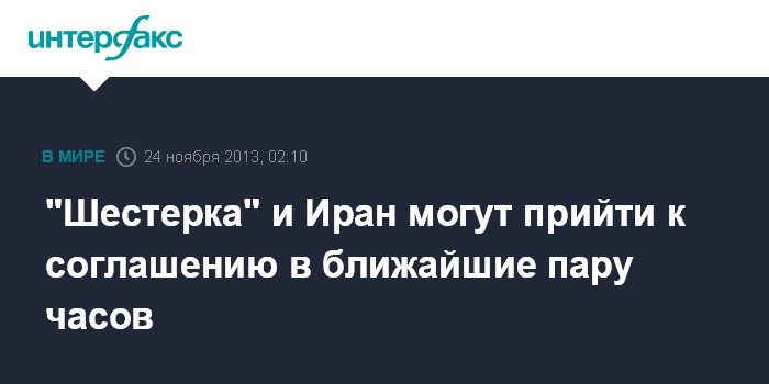 Женева. 24 ноября. ИНТЕРФАКС - "Шестерка" и Иран могут прийти к соглашению по иранской ядерной программе в ближайшие пару часов, заявил источник в иранской делегации.