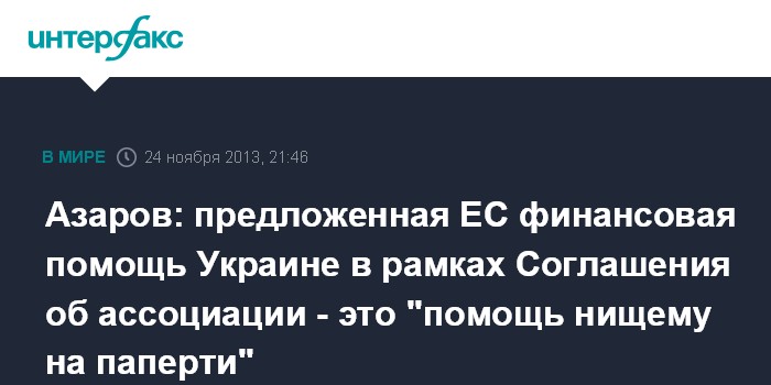 "Нам сказали, что Украина может рассчитывать на миллиард евро. Один миллиард евро - это ничего. Это, можно сказать, помощь нищему на паперти", - сказал Н.Азаров в интервью программе "Воскресное "Время"" на Первом канале российского телевидения.