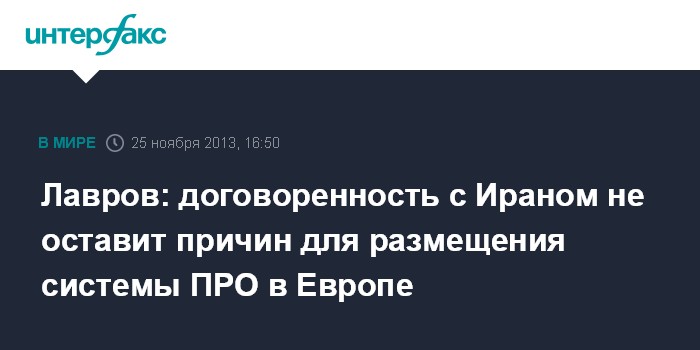 Рим. 25 ноября. INTERFAX.RU - Глава МИД России Сергей Лавров считает, что для создания системы ПРО в Европе не останется оснований в случае выполнения соглашения по иранской ядерной программе, заключенного в минувшие выходные между Тегераном и "шестеркой" международных посредников.
