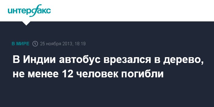 Дели. 25 ноября. INTERFAX.RU - По меньшей мере, 12 человек погибли и еще 20 получили ранения после того, как автобус с пассажирами врезался в дерево в Индии, сообщают в понедельник местные СМИ.