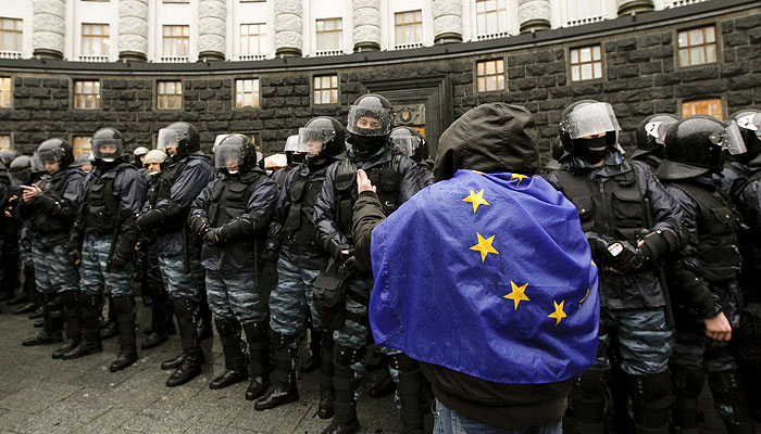В понедельник у здания правительства Украины в Киеве продолжился митинг сторонников евроинтеграции. Не обошлось без стычек с милицией – был применен слезоточивый газ. Митингующие бросали в сторону милиции различные предметы, сотрудники "Беркута" (спецподразделение. – ИФ) были вынуждены надеть противогазы и выстроить живое ограждение. Как утверждают в МВД, активисты под флагами "Свобода" распылили газ против сотрудников милиции.