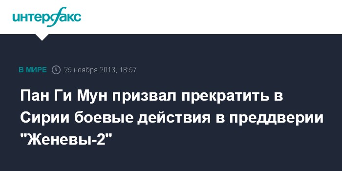 Нью-Йорк (ООН), 25 ноября. INTERFAX.RU - Сторонам сирийского конфликта перед мирными переговорами в Женеве следует подумать о том, чтобы прекратить боевые действия, заявил в понедельник генсек ООН Пан Ги Мун.