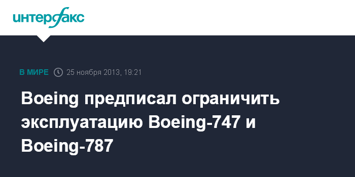 Москва. 25 ноября. INTERFAX.RU - Boeing выдал предписание авиакомпаниям по ограничению эксплуатации самолетов Boeing-747 и Boeing-787 Dreamliners. Ограничения коснутся и части флота российской грузовой авиакомпании AirBridgeCargo (ABC).