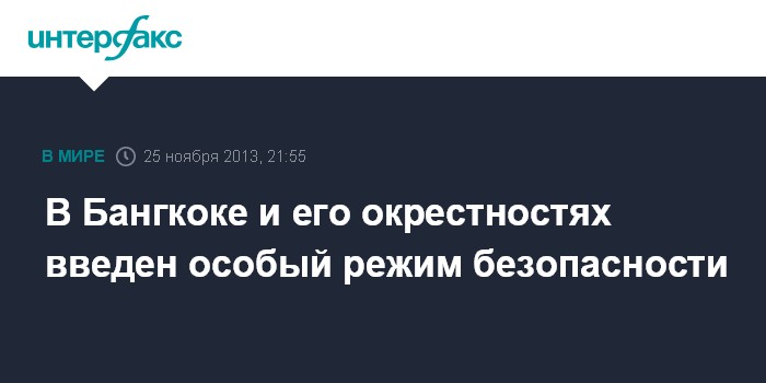 Пекин. 25 ноября. INTERFAX.RU - Премьер-министр Таиланда Йинглак Чинават объявила о введении особого режима безопасности в столице Бангкоке и прилегающих к ней населенных пунктах, сообщает в понедельник агентство AP.