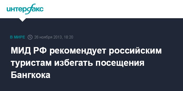 Москва. 26 ноября. INTERFAX.RU - МИД РФ не исключил дальнейшего обострения ситуации в Бангкоке, призвав россиян воздерживаться от посещения столицы Таиланда.