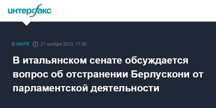 Брюссель. 27 ноября. INTERFAX.RU - Члены верхней палаты итальянского парламента приступили к дебатам о предстоящем голосовании по вопросу лишения экс-премьера страны Сильвио Берлускони статуса сенатора, передает в среду телевидение Италии.