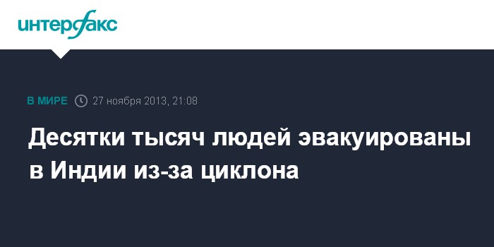 Дели. 27 ноября. INTERFAX.RU - Около 27 тыс. человек эвакуированы в среду на юго-востоке Индии из-за приближающегося циклона "Лехар", сообщают местные СМИ.