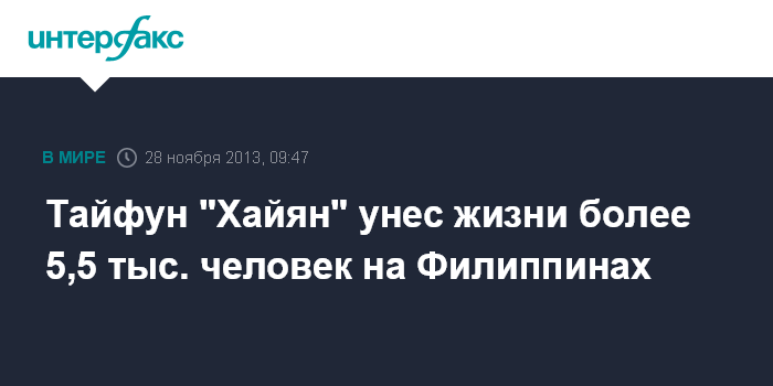 Гонконг. 28 ноября. INTERFAX.RU - Число жертв разрушительного тайфуна "Хайян" на Филиппинах достигло 5560 человек, сообщают в четверг местные СМИ со ссылкой на официальные данные.