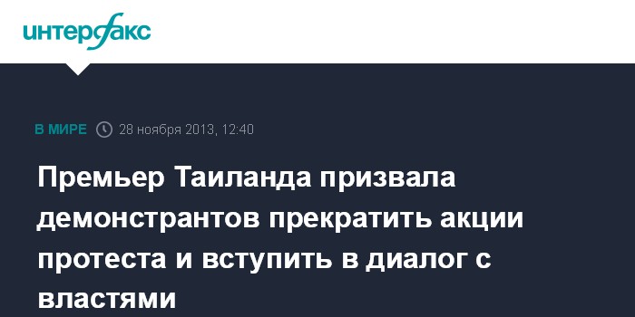 Гонконг. 28 ноября. INTERFAX.RU - Премьер-министр Таиланда Йинглак Чинават обратилась к протестующим с призывом прекратить антиправительственные выступления и начать переговоры с властями, сообщает в четверг таиландская газета Bangkok Post.