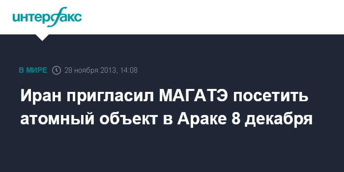 Дубай. 28 ноября. INTERFAX.RU - Власти Ирана пригласили инспекторов МАГАТЭ (Международное агентство по атомной энергии) посетить ядерный реактор на тяжелой воде в Араке, передает в четверг иранский телеканал Press TV.