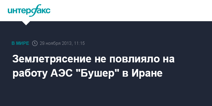 Москва. 29 ноября. INTERFAX.RU - Землетрясение в Иране не оказало влияния на работу АЭС "Бушер", сообщили "Интерфаксу" в госкорпорации "Росатом".