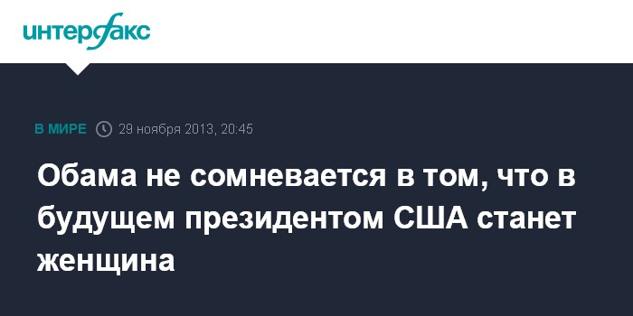 Вашингтон. 29 ноября. INTERFAX.RU - Президент США Барак Обама убежден в том, что в скором времени этот пост займет женщина.