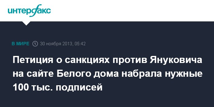 Киев. 30 ноября. ИНТЕРФАКС-УКРАИНА - Петиция с требованием применить санкции к президенту Украины Виктору Януковичу и членам Кабинета министров набрала свыше 100 тыс. подписей на сайте американского Белого дома.
