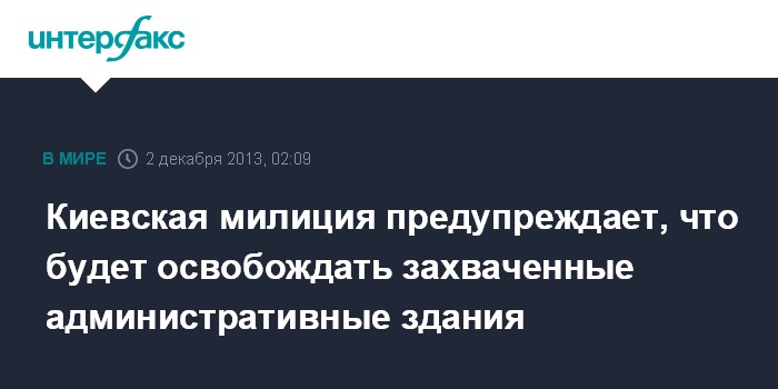Киев. 2 декабря. ИНТЕРФАКС-УКРАИНА - Милиция Киева напоминает, что самовольный захват административных зданий является противозаконным и предлагает митингующим добровольно покинуть эти объекты.