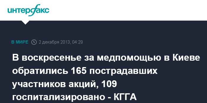 Киев. 2 декабря. ИНТЕРФАКС-УКРАИНА - За минувшие сутки к врачам бригад неотложной медицинской помощи обратились 165 травмированных участников акций протеста, проходящих в центре столицы.