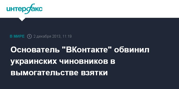 Киев. 2 декабря. INTERFAX.RU - Основатель социальной сети "ВКонтакте" Павел Дуров заявляет о попытке украинских чиновников вытребовать взятку в $100 тыс. за возврат изъятого летом этого года в Киеве оборудования сети.