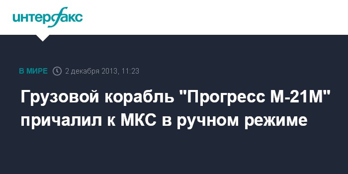 Королев (Московская область). 2 декабря. INTERFAX.RU - Транспортный грузовой корабль "Прогресс М-21М" причалил к агрегатному отсеку служебного модуля "Звезда" Международной космической станции (МКС) без использования новой аппаратуры сближения и стыковки "Курс-НА".