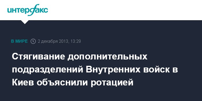 Киев. 2 декабря. ИНТЕРФАКС-УКРАИНА - Из нескольких регионов Украины в Киев прибывают военнослужащие внутренних войск для того, чтобы заменить тех, которые уже длительное время обеспечивает правопорядок возле административных зданий столицы. Существенного увеличения количества военнослужащих в столице не будет, сообщили "Интерфаксу" в пресс-службе внутренних войск Украины.