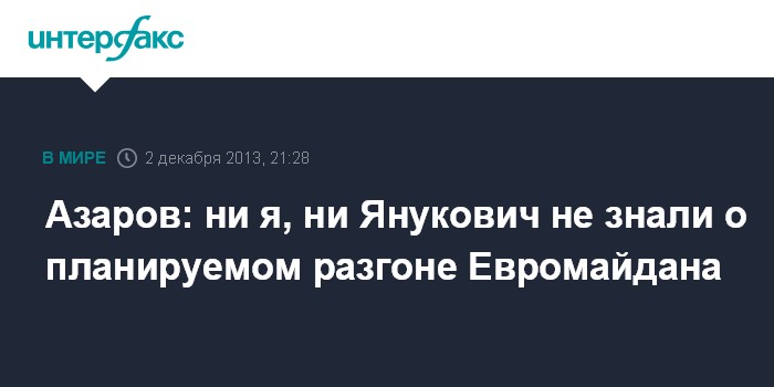 Киев. 2 декабря. ИНТЕРФАКС-УКРАИНА - Премьер-министр Украины Николай Азаров заявляет, что ни он, ни президент Украины Виктор Янукович не знали о планируемом правоохранителями силовом разгоне Евромайдана в ночь на 30 ноября.