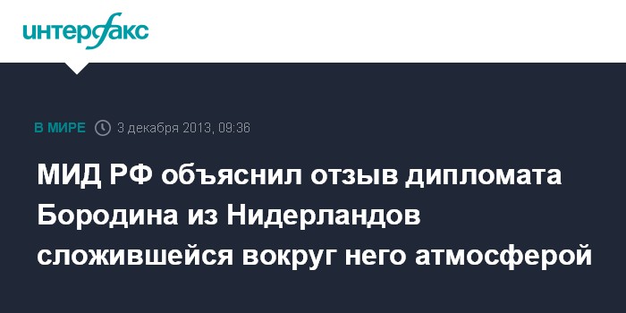 Москва. 3 декабря. INTERFAX.RU - Российский дипломат Дмитрий Бородин завершил свою командировку в Нидерландах по собственной просьбе, сообщил департамент информации и печати МИД РФ.
