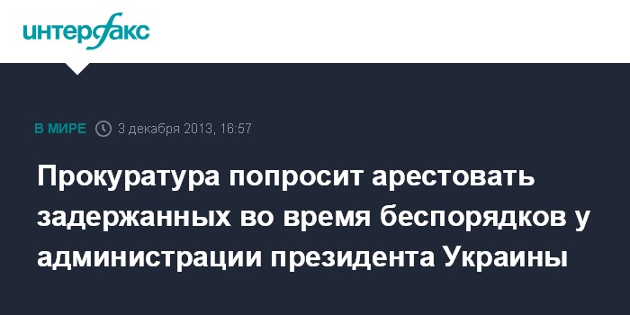Киев. 3 декабря. INTERFAX.RU - Представители киевской прокуратуры будут просить суд в украинской столице о мере пресечения в виде взятия по стражу для девятерых задержанных по подозрению в причастности к массовым беспорядкам на Банковой улице 1 декабря.