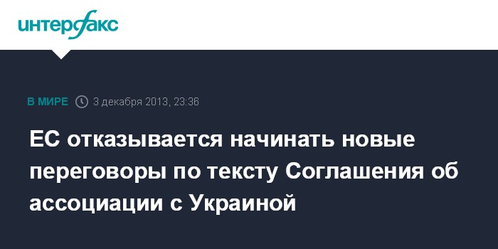 Брюссель. 3 декабря. INTERFAX.RU - Европейский Союз не будет открывать новые переговоры по тексту уже парафированного Соглашения об ассоциации и глубокой и всеобъемлющей зоне свободной торговли с Украиной, заявила Майя Косьянчич, представитель главы европейской дипломатии Кэтрин Эштон.