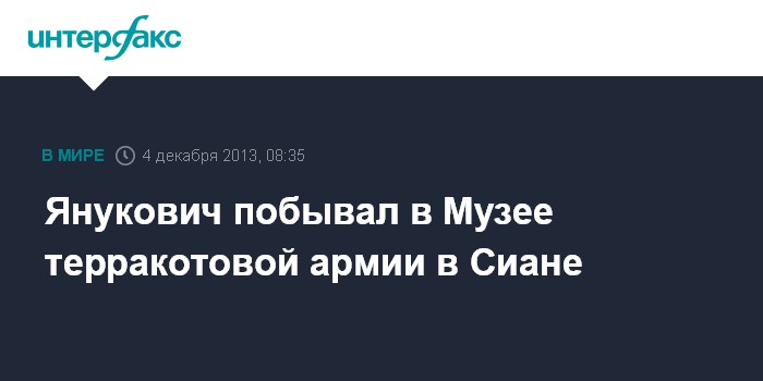 Киев/Пекин. 4 декабря. INTERFAX.RU - Президент Украины Виктор Янукович осмотрел экспозицию Музея терракотовой армии императора Цинь Шихуана в г. Сиани (провинция Шэньси, Китай), сообщила пресс-служба главы украинского государства.