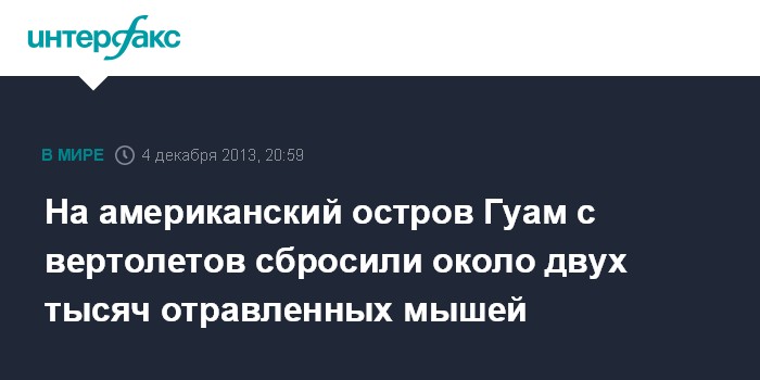 Вашингтон. 4 декабря. INTERFAX.RU - Около 2 тыс. мертвых отравленных токсином мышей сброшены с вертолетов над американским островом Гуам.