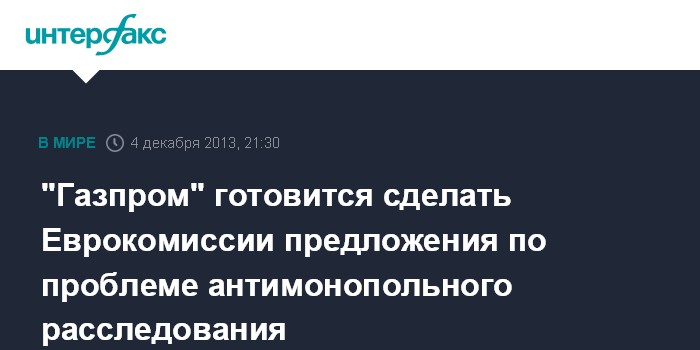 Как сообщил "Интерфаксу" источник в учреждениях Евросоюза, "Газпром" "намерен сделать предложения Еврокомиссии" с целью найти решение, касающееся европейского расследования, подозревающего применение российской монополией антиконкурентной практики на газовом рынке ЕС. Эти предложения, считает источник, будут выдвинуты в кратчайшие сроки.